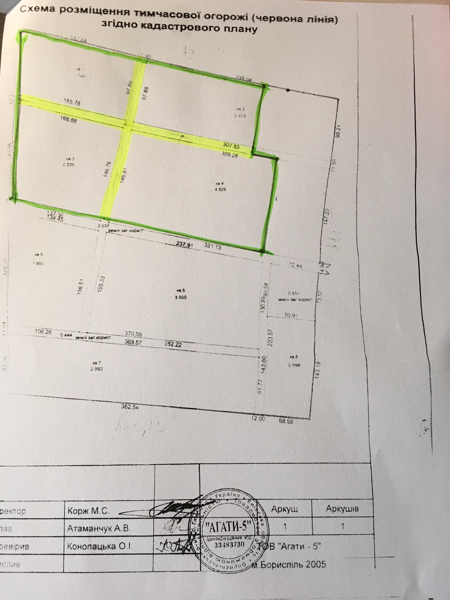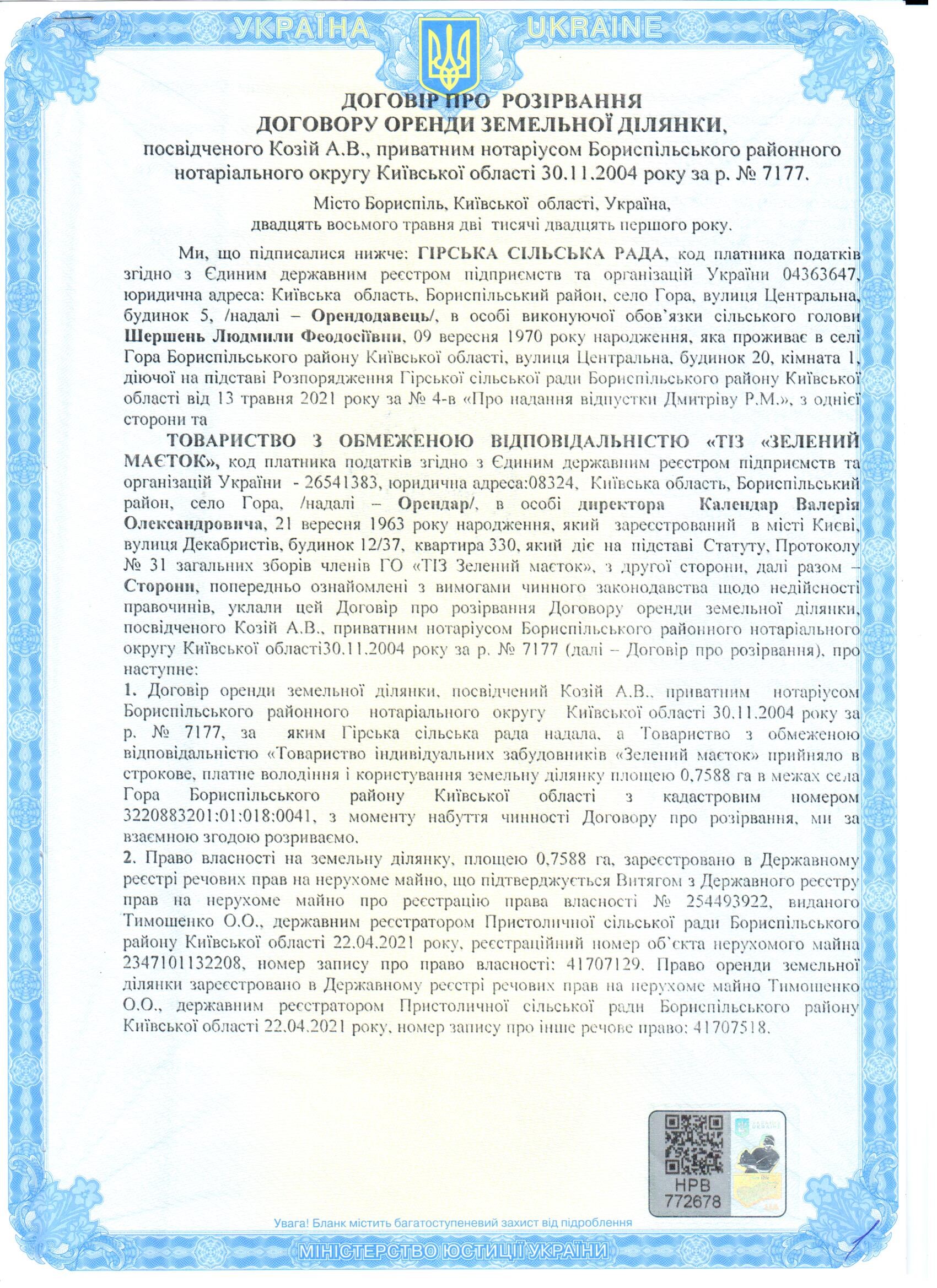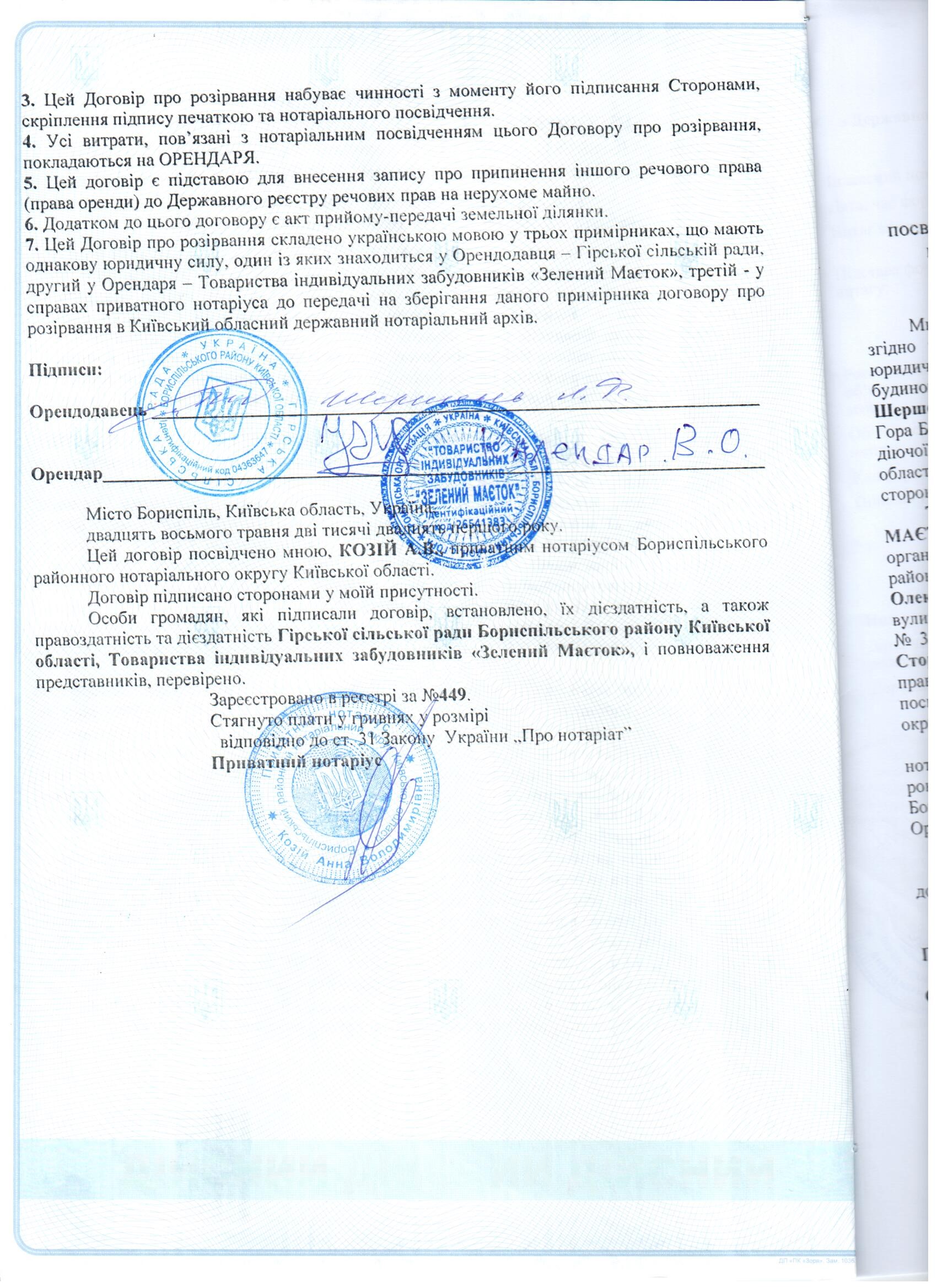 30 ноября 2004 года между Сельским Советом села Гора и нашей организацией ( ГО «ТИЗ «Зеленая усадьба») на 49 лет был заключен договор аренды земли 9,967 га для строительства и обслуживания домов. (Этот участок выделен на схеме зеленым цветом. )